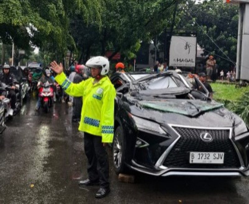 Personel Polsek Kebayoran Lama sedang mengatur lalulintas pascatewas seorang pengemudi mobll Lexus hitan, B1732 SJV yang rusak paras akibat tertimpa pohon palem pemtas jalan. Peristiwa naas ini dalam cuaca ekstrim anging beliung dan hujan deras yang melanda Jakarta, di Jalan Metro Pondok Indah, di sekitar Plaza II Pondok Indah, Kelurahan Pondok Pinang, Kecamatan Kebayoran Lama, Jakarta Selatan, Minggu siang (26/10/2025). [WAHANANEWS.CO / Iwe Kushar]