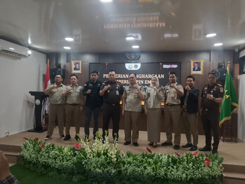 Kejari Kota Depok Arif Budiman berfoto dengan ASN dari Kementerian ATR/BPN saat penyerahaan penghargaan dari Menteri ATR/BPR Nusron Wahid di Kantor Kejari Kota Depok, Selasa (16/12/202t5). [DEPOK.WAHANANEWS.CO / Janter Han]