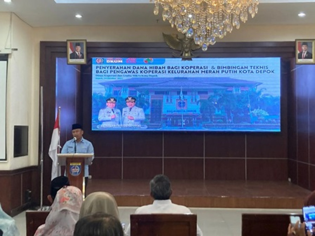 DEPOK.WAHANANEWS.CO, Balai Kota Depok – Wali Kota Depok, Supian Suri serahkan Dana Hibah dan Bimbingan Teknis (Bimtek) Pengawas Koperasi Kelurahan Merah Putih (KKMP) di Kota Depok, Jawa Barat.