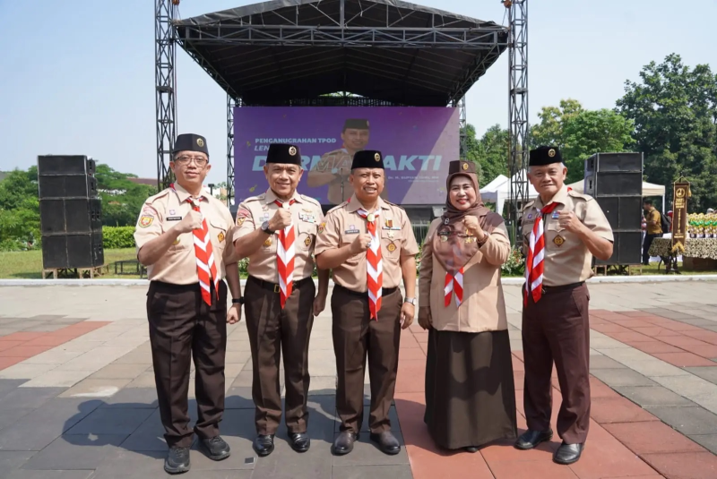 Wali Kota Depok Supian Suri (tengah) hadir di Di perayaan tanggal kelahiran Pramuka, Milad ke-64. Kaka Suri didampingi Ketua Kwarcab Pramuka Kota Depok, Nina Suzana (sebelah kiri) dan Ketua Panitia, Adnan Mahyudin (paling kiri). Tema “Harmoni Pramuka Bersama Masyarakat Berbudaya Bersama Depok Maju’ bertekad ikut membangun karakter generasi muda bangsa Indonesia, Alun Kota Depok, Cilodong, Ahad (5/10/2025). [DEPOK.WAHANANEWS.CO / Berdepgo]